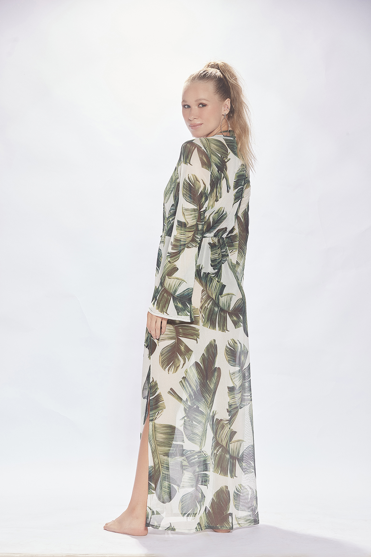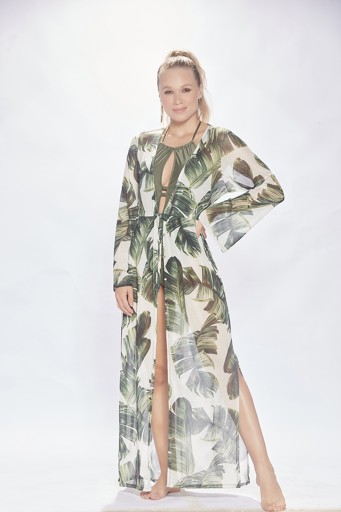 Para deslizar elegantemente até à praia ou piscina, com um padrão botânico inspirado em palmeiras e tempo quente. O complemento perfeito para desfolhar a sua swimwear.